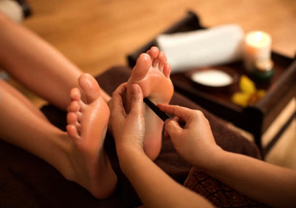 Lõõgastav jalatalla massaaž, muu hulgas töödeldakse Idamaade meditsiinil põhinevaid akupressuuri punkte.